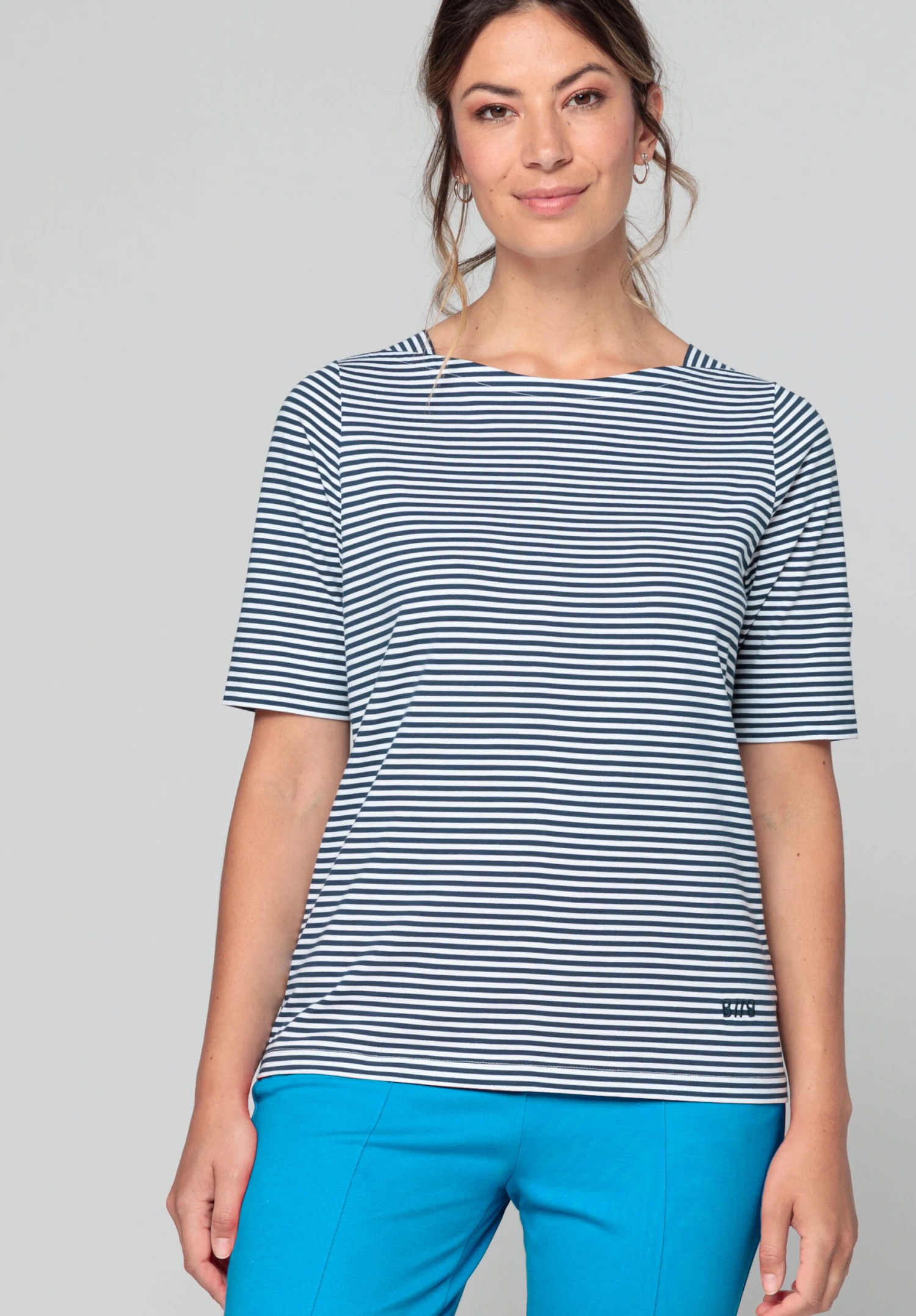 Wir lieben Streifen – Mit unserem neuen Kurzarmshirt Lotti im Ringel-Look und coolen Trendfarben kreierst du ganz easy einen lässigen und unkomplizierten Alltags-Look. Die softe Baumwolle mit Elasthan in Kombination mit der lockeren Passform vermittelt ein gutes Tragegefühl. Der maritime U-Boot Ausschnitt mit kleinem Detail und der längere Kurzarm machen das Shirt zu einem Allrounder. Sichere dir jetzt dein neues It-Piece für deinen Kleiderschrank!