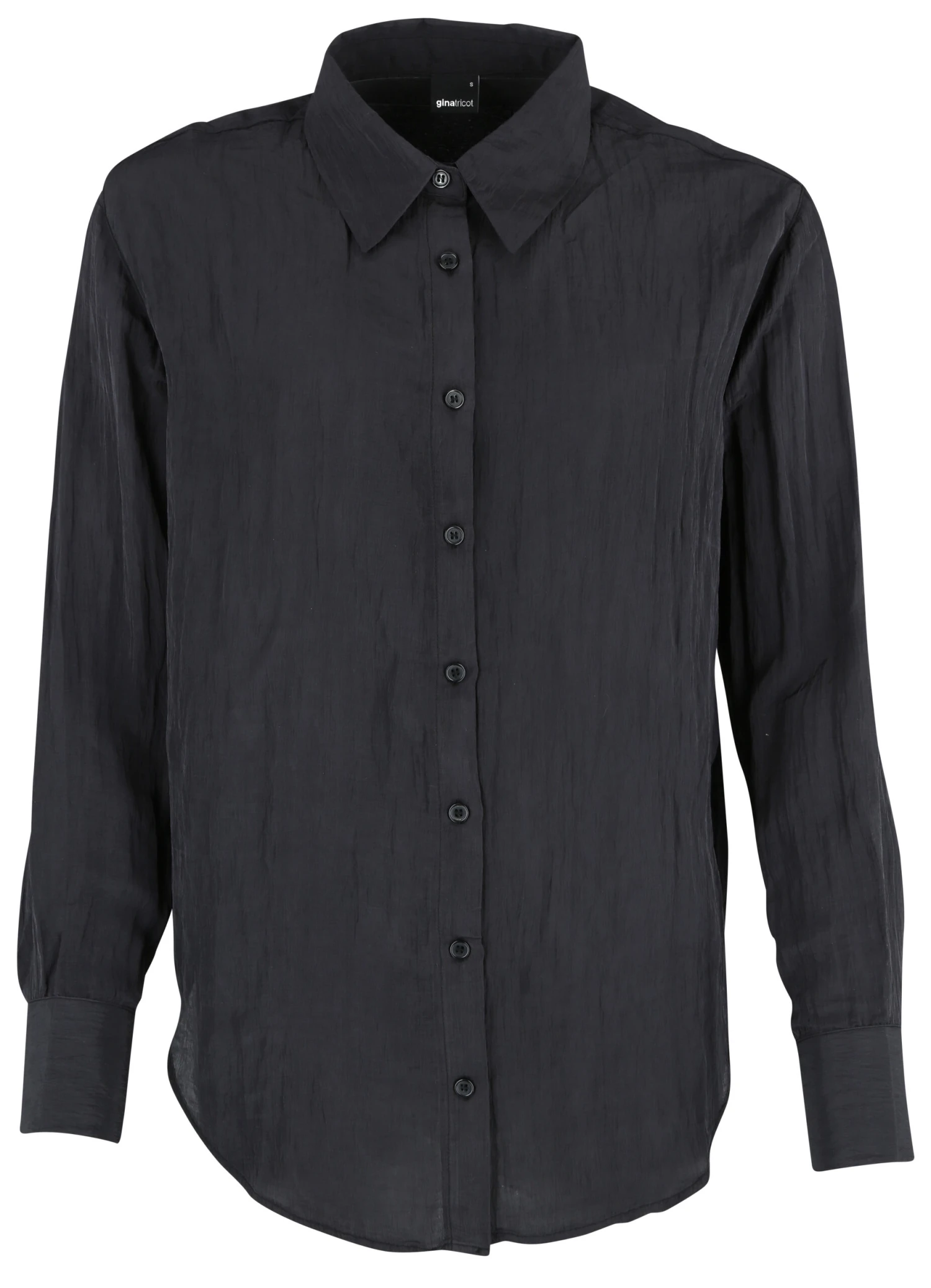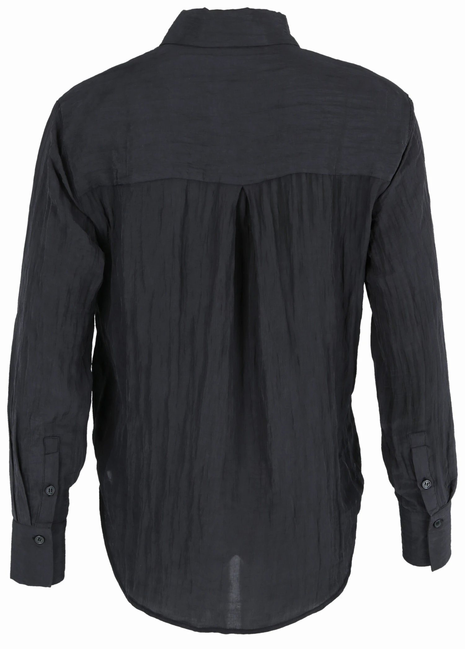 Zerknittertes Hemd mit Knöpfung vorne. Das Hemd ist schwarz und hat einen Kragen. Es hat lange Ärmel mit Knopf und Manschette.