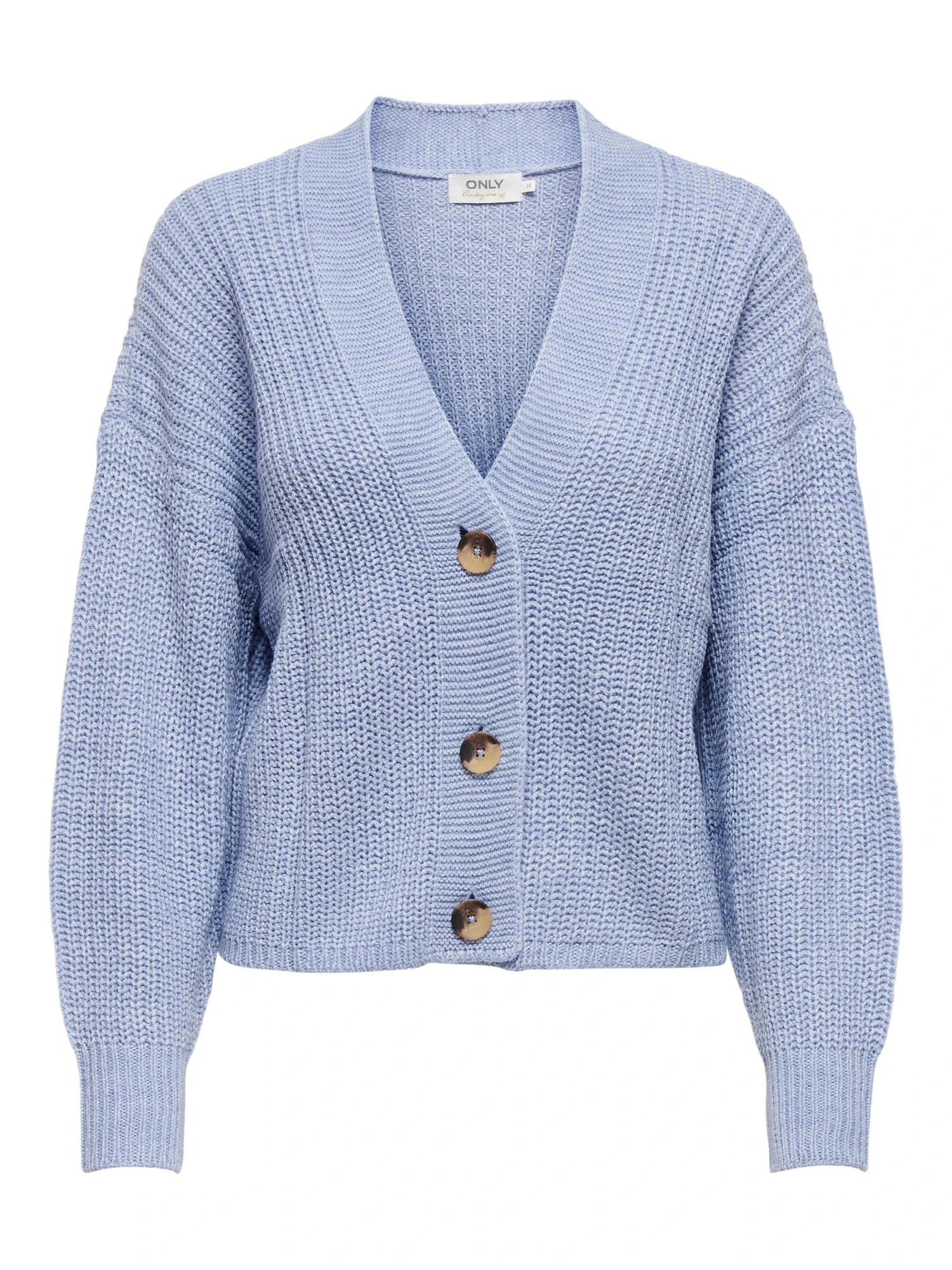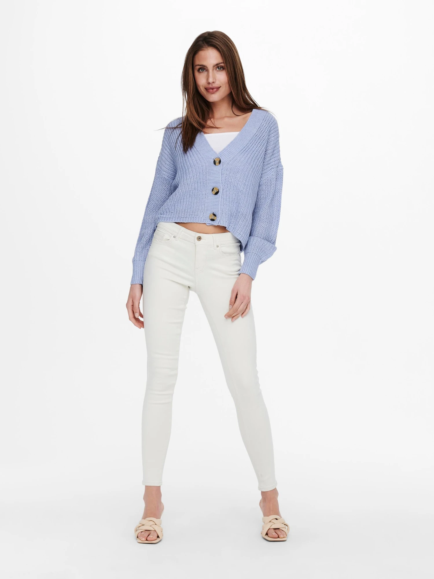 – Strickjacke mit Verschluss vorn- V-Ausschnitt- Gerippte Säume- Länge: 50 cm in Größe S- Das Model trägt Größe S