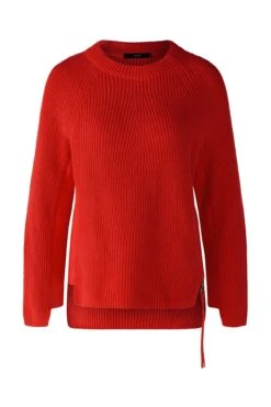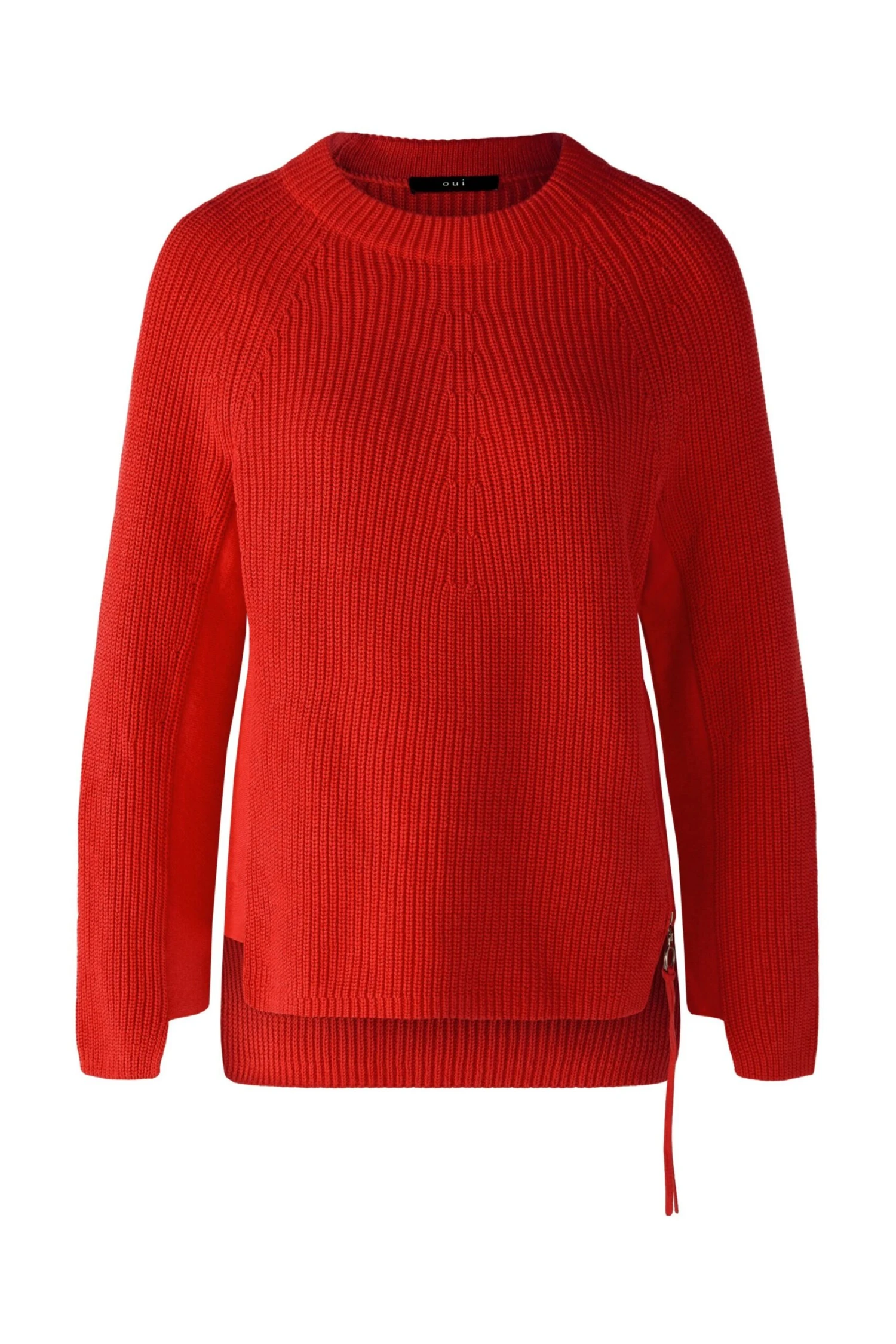 Reine Baumwolle, in Rippe gestrickt, mit figurschmeichelndem seitlichem Feinstrickeinsatz Gerade Form, mit verlängertem Rückteil Hoher Rundhals und Minderungen im Vorderteil Raglanform mit langem Arm, unterschiedliche Längen am Abschluss An einer Seite eingearbeiteter Reißverschluss mit Metallpulle
