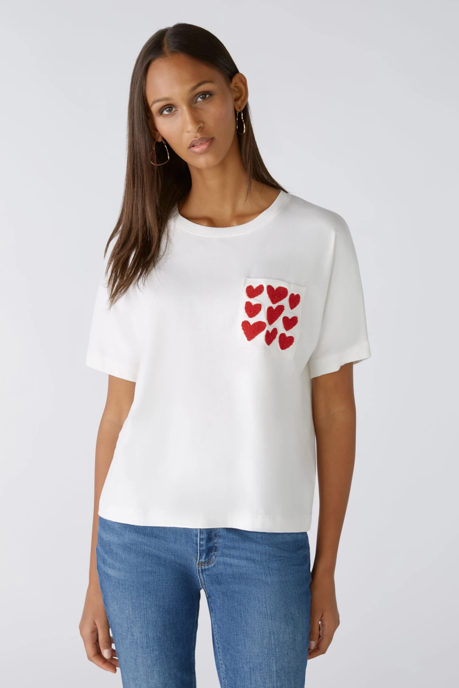 Single Jersey in einer Baumwoll-Modalmischung mit Elasthan Oversized geschnitten, reguläre Länge Rundhals mit Rippbündchen Die Schulter ist so weit überschnitten, dass der Ärmel bis zur Milanolänge fällt Aufgenähte Brusttasche mit weicher Herzchen Stickerei in 3D Optik Thematisch passender Innendruck mit Love Letter Stempel