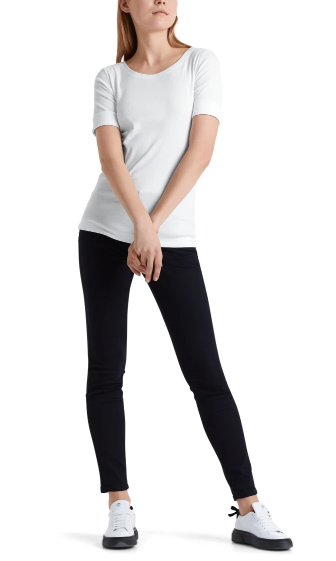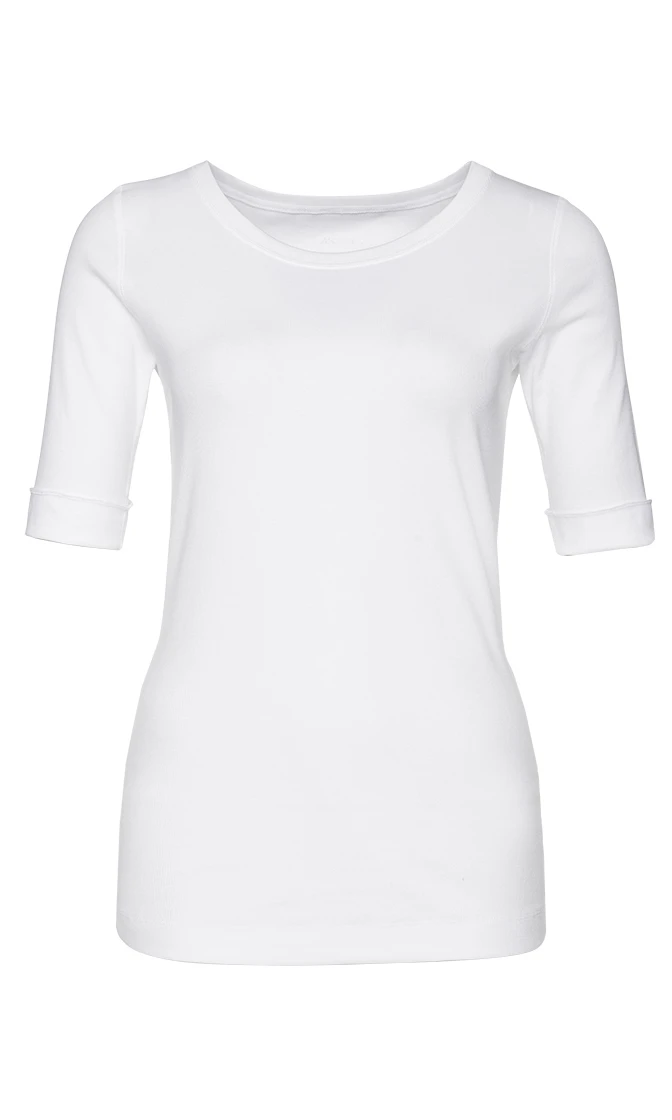 Rundhals-Shirt mit halben Ärmeln|Feine Ripp-Optik trifft bei dem Marc Cain Shirt auf ein besonders weiches Baumwoll-Gemisch plus genau dem richtigen Stretchanteil. Tonale Overlocknähte an den Ärmeln schenken dem leicht taillierten Basic einen coolen Touch. Ein Style, der auf entspannte Weise Casual-Stylings ergänzt.|Farbe: white|Elastische Baumwoll-Mischung mit softem Griff|Abgesetzter, weiter Rundhals-Ausschnitt|Das Model ist 179 cm groß und trägt N3/38.|Armlochnähte in Inside-Out-Look