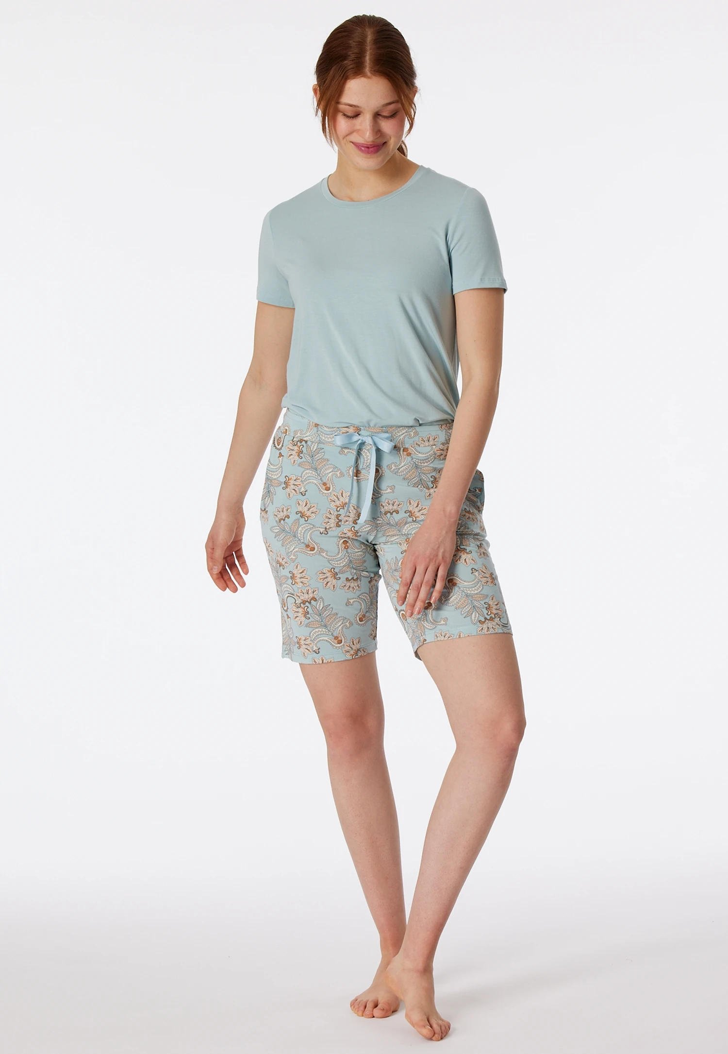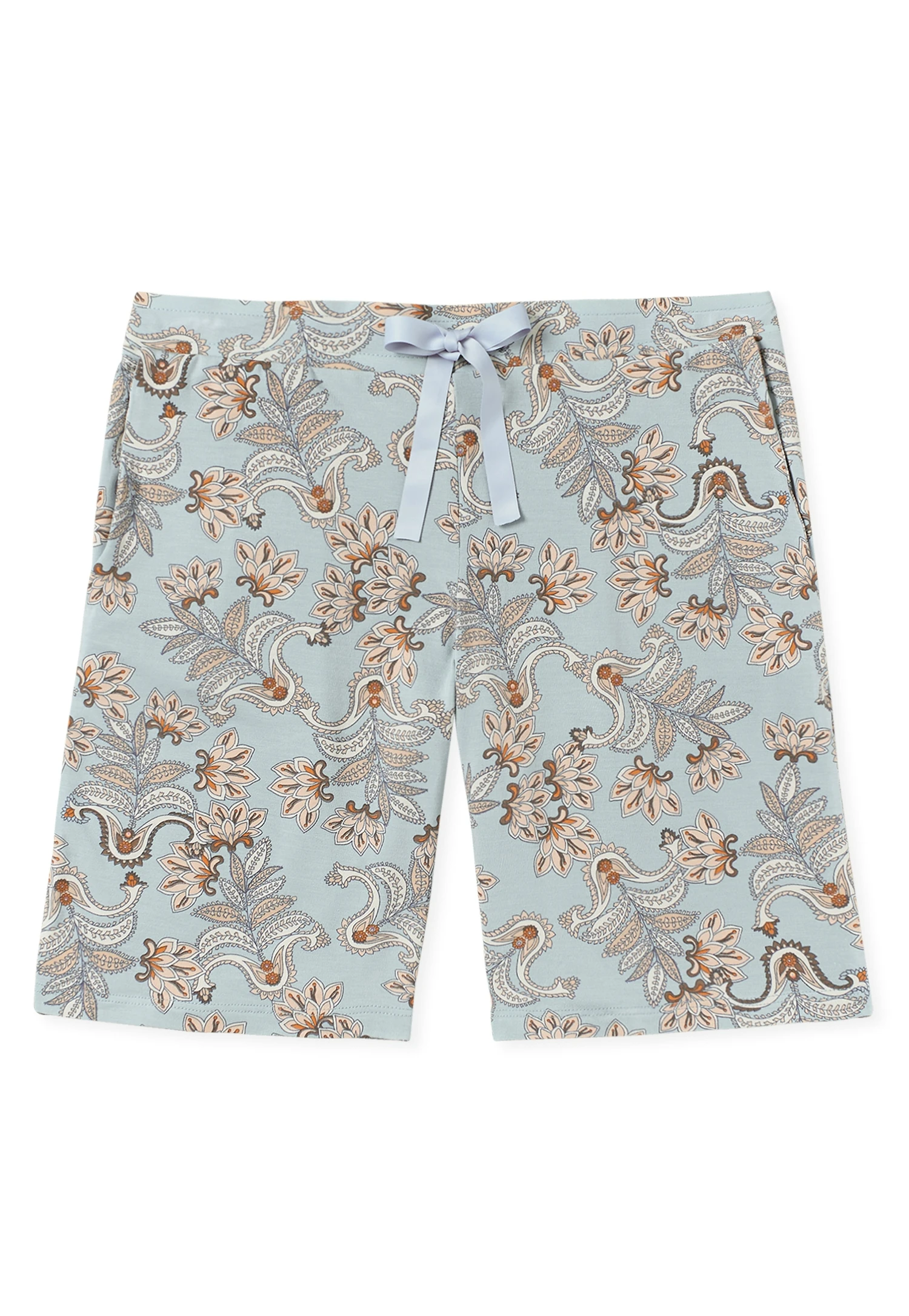 blau gemusterte Bermuda für Damen, aus der beliebten SCHIESSER Serie „Mix+Relax“, seitliche Eingrifftaschen, elastischer Bund mit Satin-Bindeband, atmungsaktiv, pflegeleicht und weich fließend, in angenehm weicher, elastischer Single-Jersey-Qualität, ideal zum Kombinieren mit anderen Artikeln aus der Mix+Relax Serie!