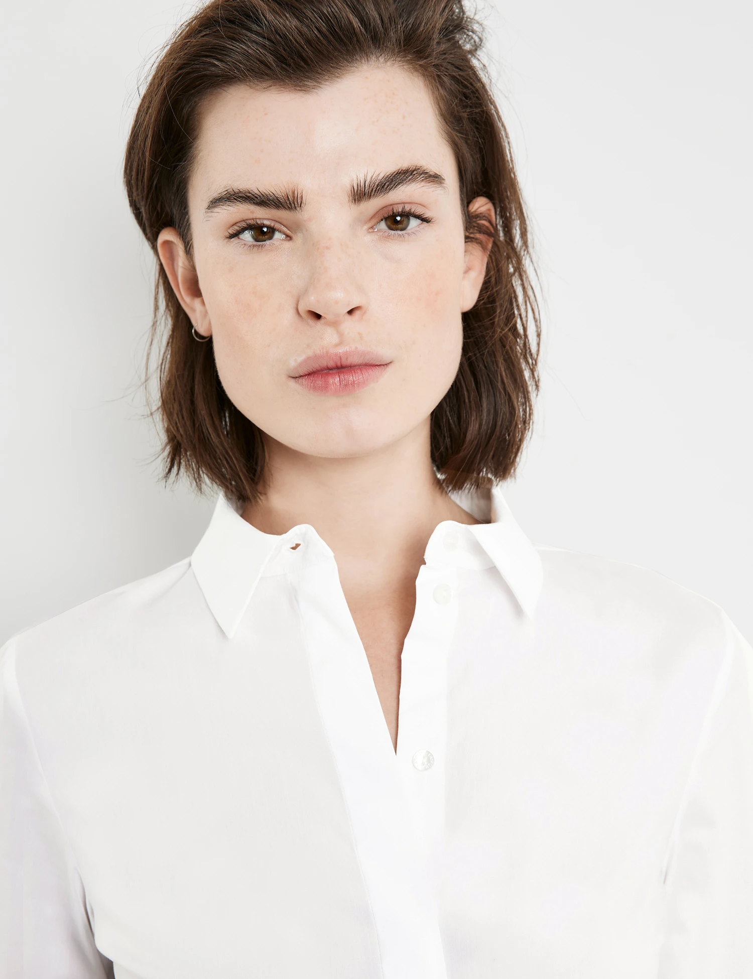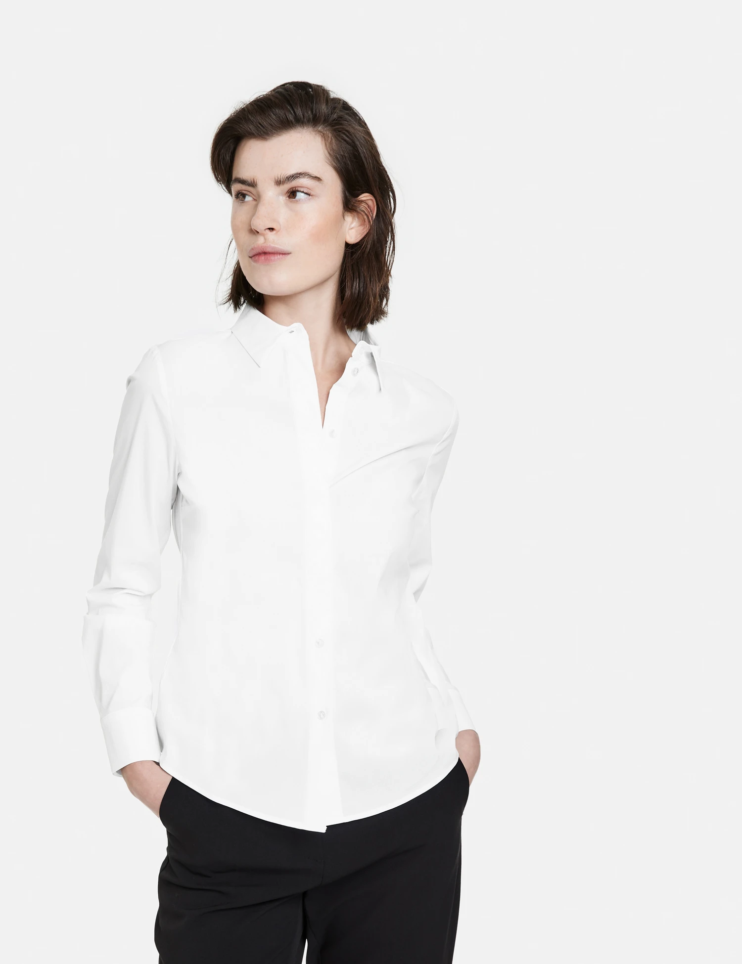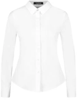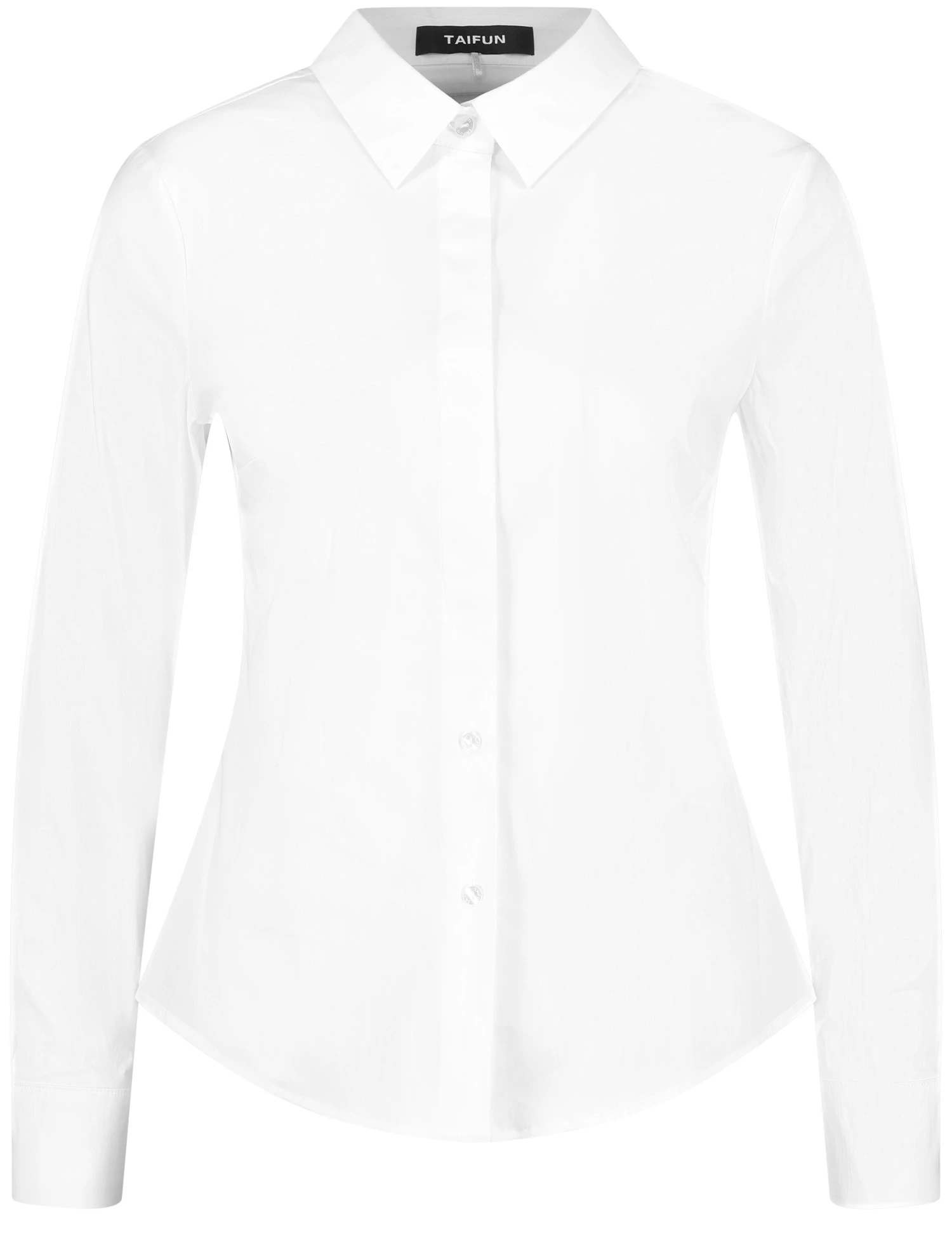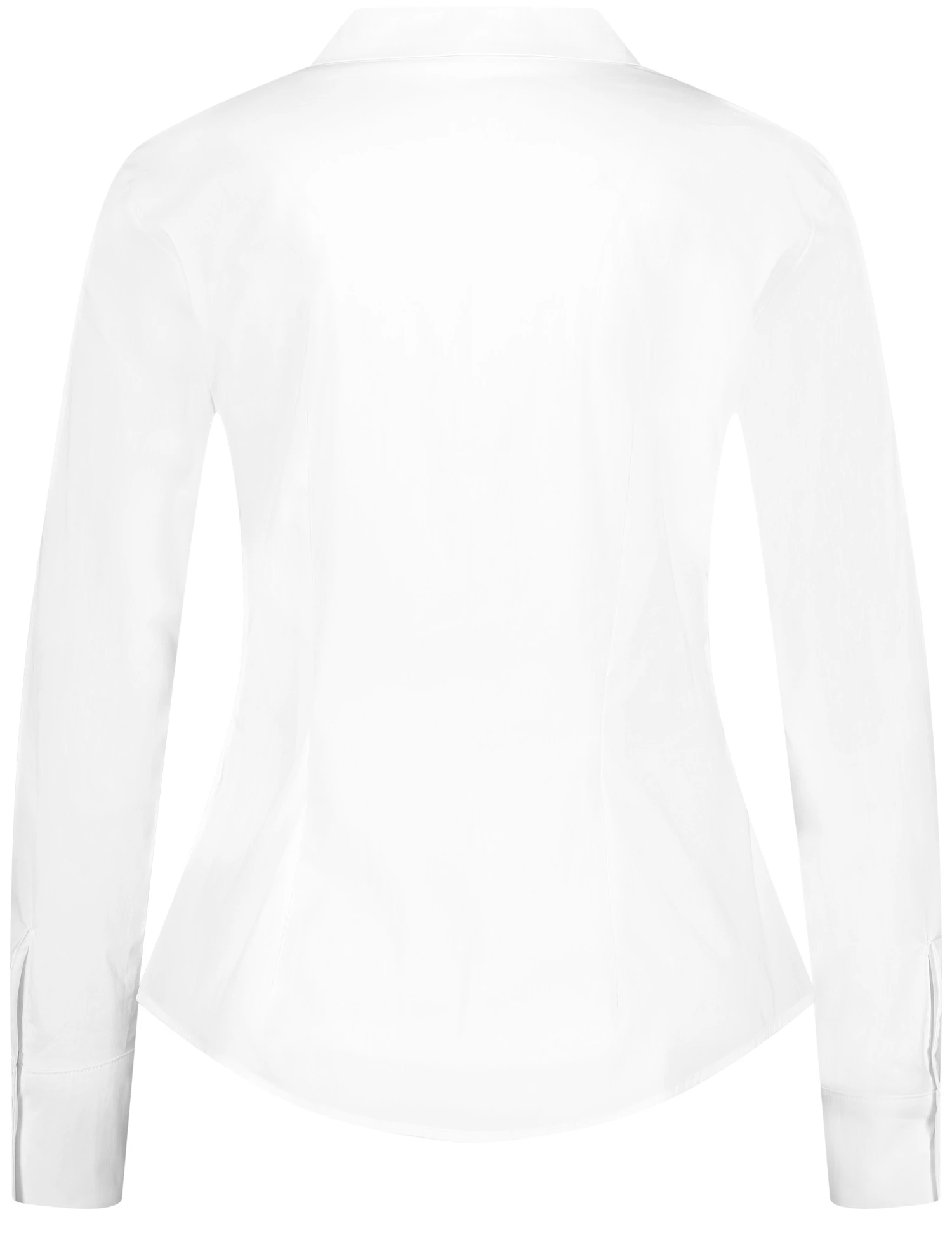 Formende Teilungsnähte im Rücken. Klassiker dürfen in keinem Kleiderschrank fehlen! So auch diese weiße Hemdbluse. Der figurumspielende, taillierte Style zeigt sich im stiltypischen Design mit Hemdkragen, verdeckter Knopfleiste und langem Arm mit Manschetten. Die nachhaltige Baumwoll-Qualität mit Stretchkomfort trägt sich dabei angenehm komfortabel.