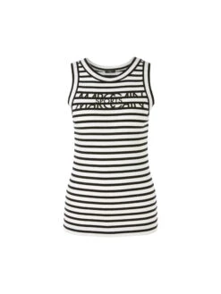 Gestreiftes, ärmelloses Top|Top aus softem Baumwollripp. Das Modell ist schmal geschnitten und allover gestreift. In der Front findet sich ein coole Grafik des Marc Cain Schriftzugs. Rundhals und Ärmelausschnitte sind durch markante Einfassungen akzentuiert.|Körpernah|Ärmellos|Made in Europe|Rundhals|Das Model ist 179 cm groß und trägt N3/38.